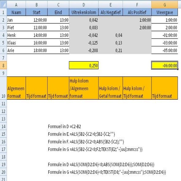 Rekenen met negatieve tijden kan wat problemen opleveren. Ik heb hier voor een oplossing gekozen met 3 hulpkolommen. Die kolommen zijn ,eenmaal ingevuld met formules, worden verborgen voor een netter overzicht. De oplossing heeft als nadeel dat voorwaardelijke opmaak op sommige resultaat velden niet werkt.